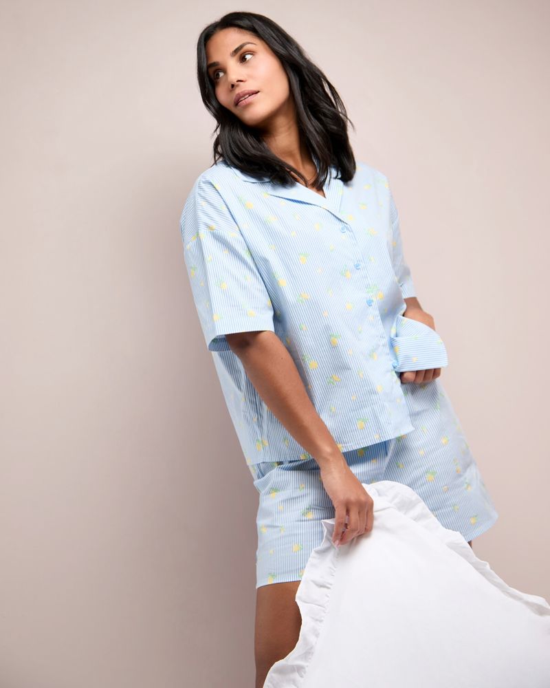 This pyjama set features fine stripes for a timeless look, complemented by an all-over lemon motif. Designed for relaxed comfort, it includes a short-sleeved, button-through top and matching shorts with an adjustable drawstring waist.