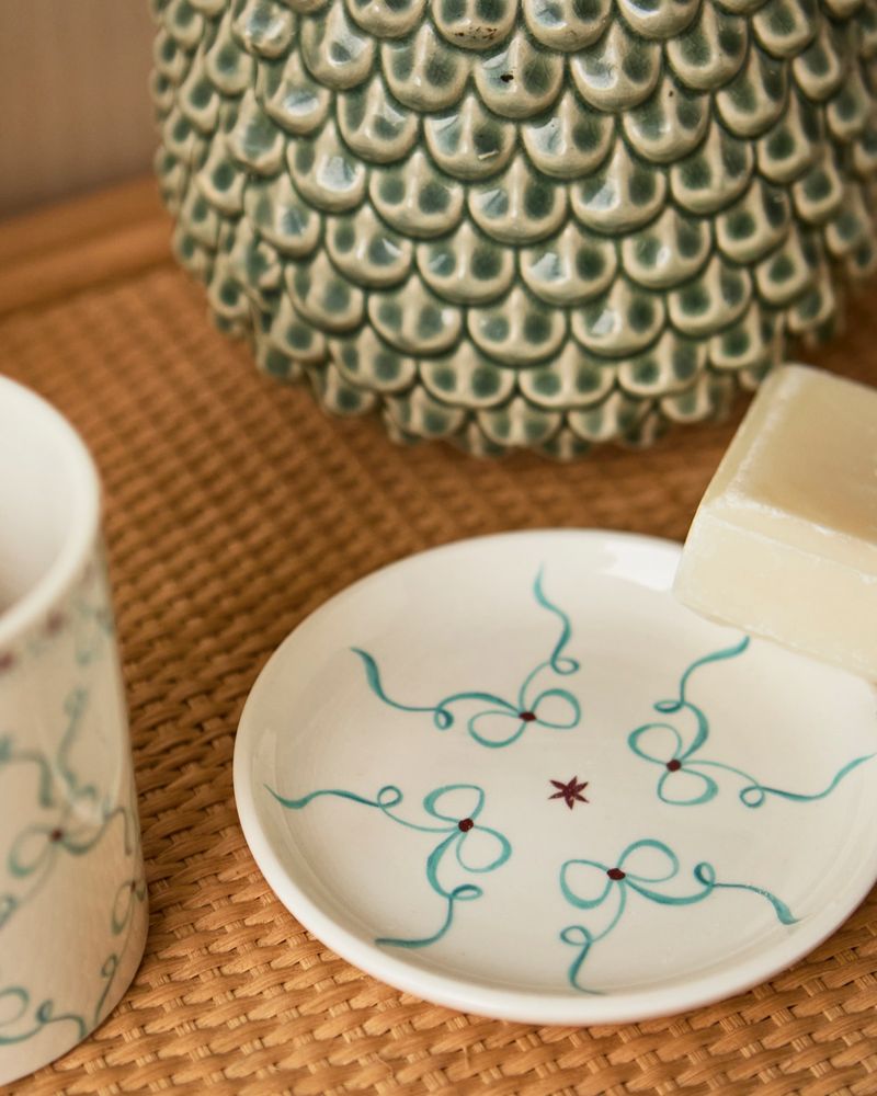 This elegant soap dish features a hand-painted bow motif in a soothing blue palette, accented with contrasting red details. Expertly crafted from ceramic, it is finished with a sleek, high-gloss shine that adds an eclectic touch to any bathroom or kitchen space. Matching items available; sold separately. Brought to you by Irish designer Carolyn Donnelly, exclusively for Dunnes Stores.