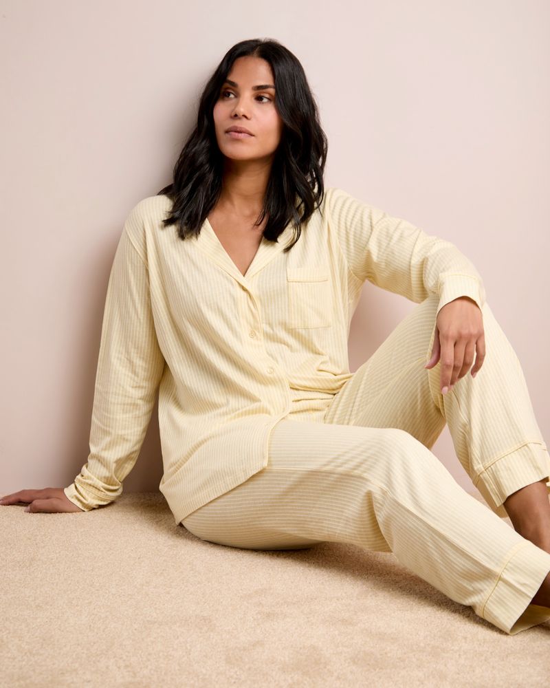 This striped pyjama set is made from a soft cotton-modal blend, featuring a long-sleeved, button-through top with a classic revere collar and matching bottoms. Perfect for quiet evenings in and slow mornings at home.