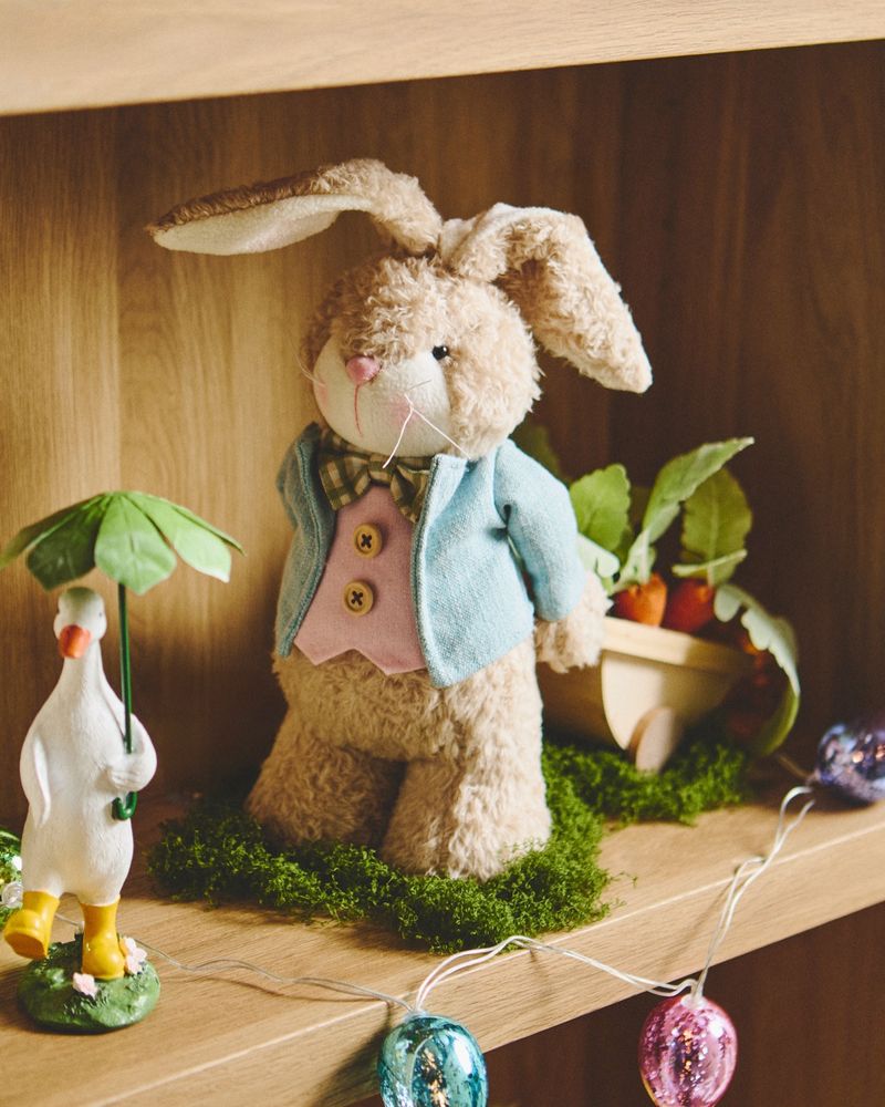 This charming standing decoration features an adorable bunny dressed in a smart blazer with a playful bowtie, holding a wooden wheelbarrow filled with faux carrots. Lightweight yet durable, it makes a delightful and eye-catching addition to any Easter display.