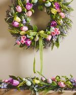 This vibrant wreath combines pastel-coloured flowers, lush greenery, and colourful eggs, all finished with a green velvet ribbon tied in a bow. Complete with a handy rope hanging loop, it’s the perfect way to add a festive touch to your home this Easter.