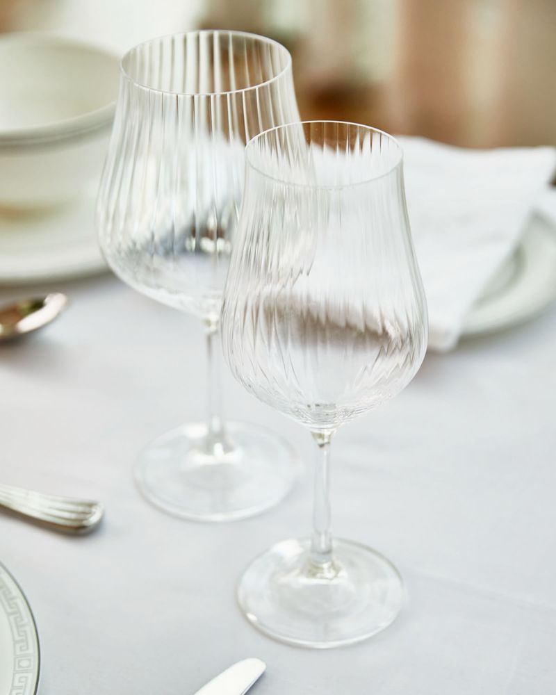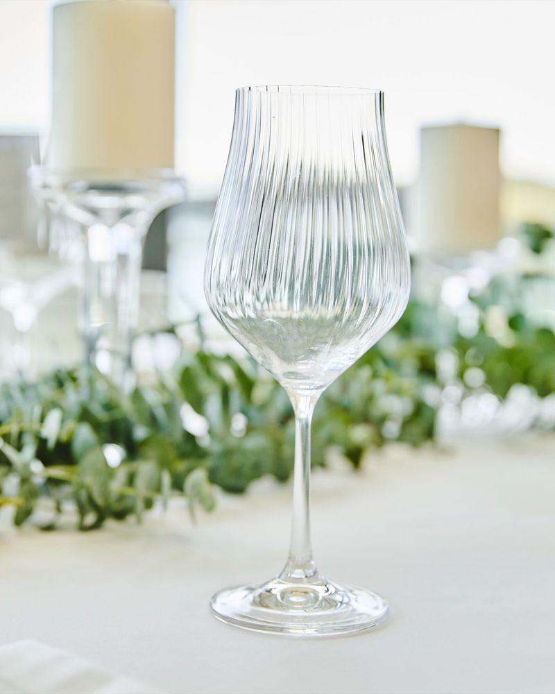 This rippled white wine glass has been designed with a slight narrowing towards the top. Classically chic, it will look elegant on any dining table. Matching items available: sold separately. Francis Brennan the Collection is available exclusively at Dunnes Stores.