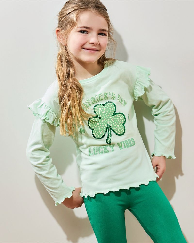 This long-sleeved cotton t-shirt is a sweet choice for their St Patrick’s Day outfits. Delicate ruffle details at the shoulders and pretty lettuce trims add a lovely touch, while a shamrock print with sequin embellishments completes the look.