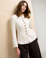 This jacket is a chic addition to your smart-casual wardrobe. It features a flattering cropped silhouette, a sleek collarless neckline, and a button-through front adorned with ornate gold-toned buttons for a touch of sophistication. Gallery is available exclusively at Dunnes Stores.
