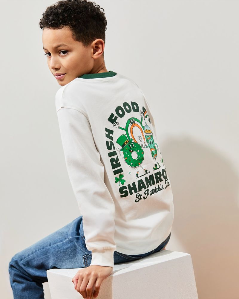 This pure cotton long sleeve top is perfect for adding a fun, festive touch to their outfit. Featuring an Irish food and drink inspired print on the chest and back, with ribbed neckline and cuffs, it’s a lovely choice for St Patrick’s Day and beyond.