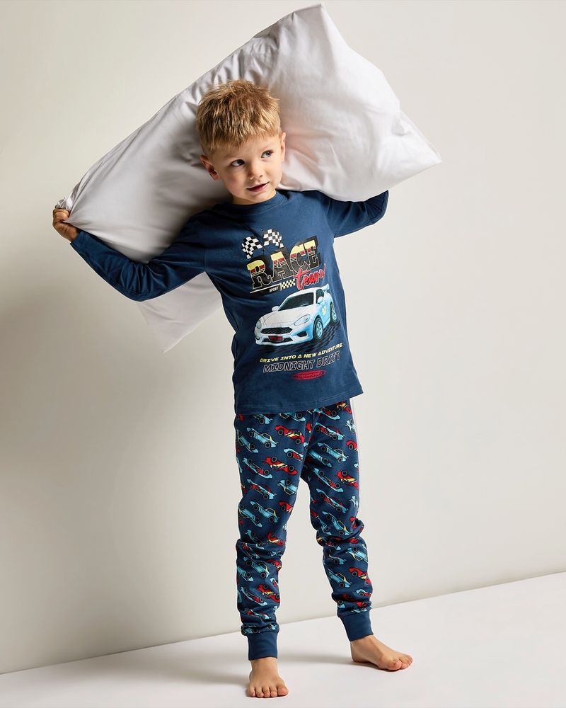 Made from soft cotton jersey, these cosy pyjamas include a long-sleeved top with a fun car design on the front and matching cuffed bottoms. A comfortable nighttime staple for little ones.