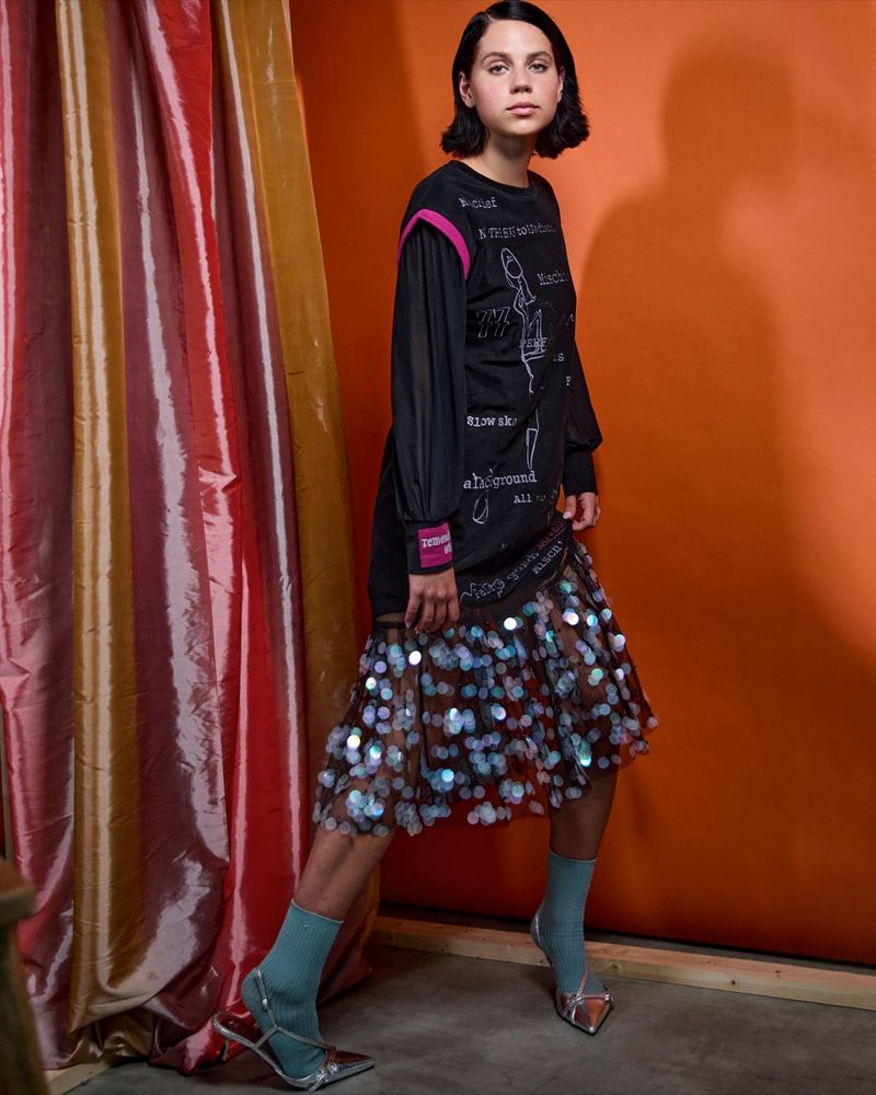 A study in layered textures, this dropped-shoulder dress from Joanne Hynes combines an above-knee velvet body with a sheer tulle overlay, creating depth and fluid movement. The velvet carries sketches from the designer’s journals, recalling teenage nights in her hometown, while side-seam pockets, contrast rib trims, and an embroidered “Remember When” patch on the cuff add subtle, personal touches. Reflective sequins and beads gather at the sheer hem, catching the light with every step and hinting at playful, fleeting memories. Joanne Hynes is a Limited Edition crafted range exclusively for Dunnes Stores.