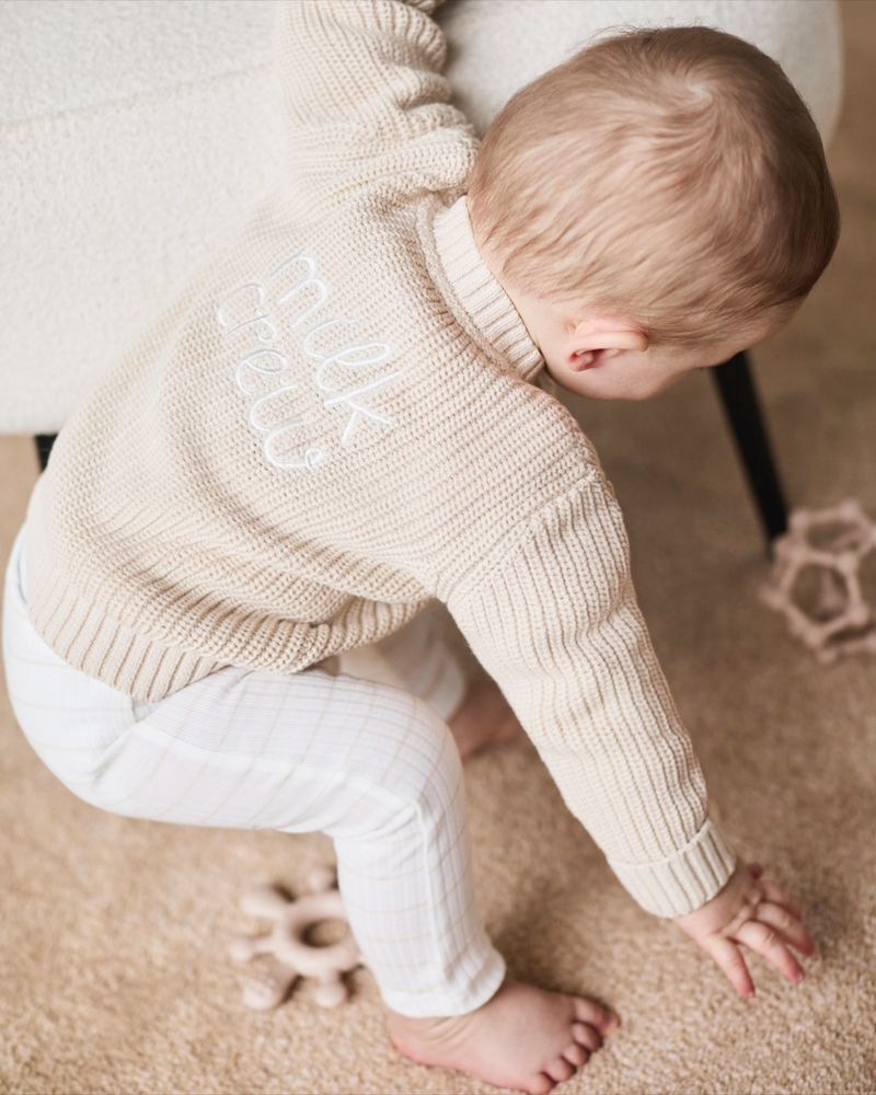 This pure cotton knit cardigan is wonderfully soft and cosy for little ones. It features a classic button-front design and ribbed trims, with 'Milk Crew' embroidered on the back for a sweet finishing touch.