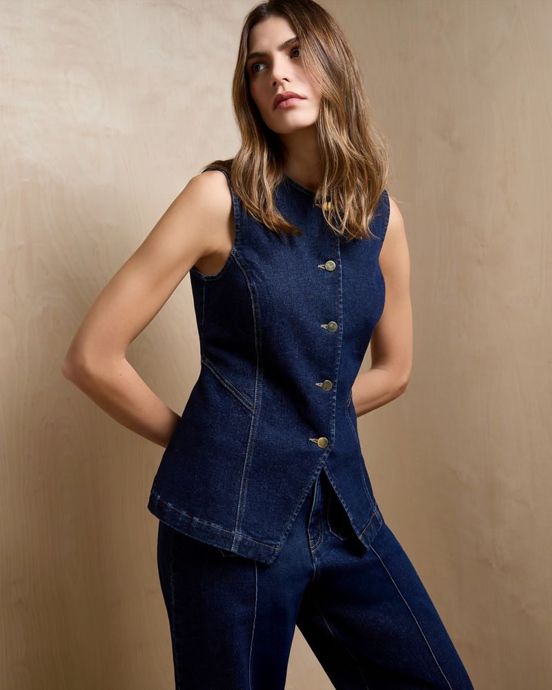 This collarless denim waistcoat is a chic update to your wardrobe. Designed in a flattering, form-fitting silhouette, it’s crafted from cotton with a touch of stretch for added comfort. Finished with metal button fastenings at the front, it delivers a timeless denim look with modern appeal. Gallery is available exclusively at Dunnes Stores.