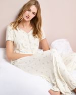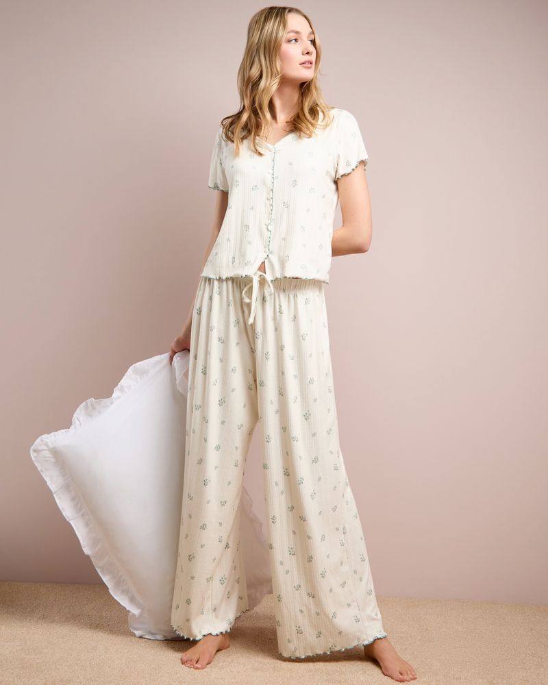 Made for winding down, this pyjama set features a short-sleeved top with an all-over green floral design, paired with matching bottoms with a drawstring waist. Crafted in classic pointelle with pretty lettuce trims, the set has a light, airy feel that’s ideal for a restful night’s sleep.