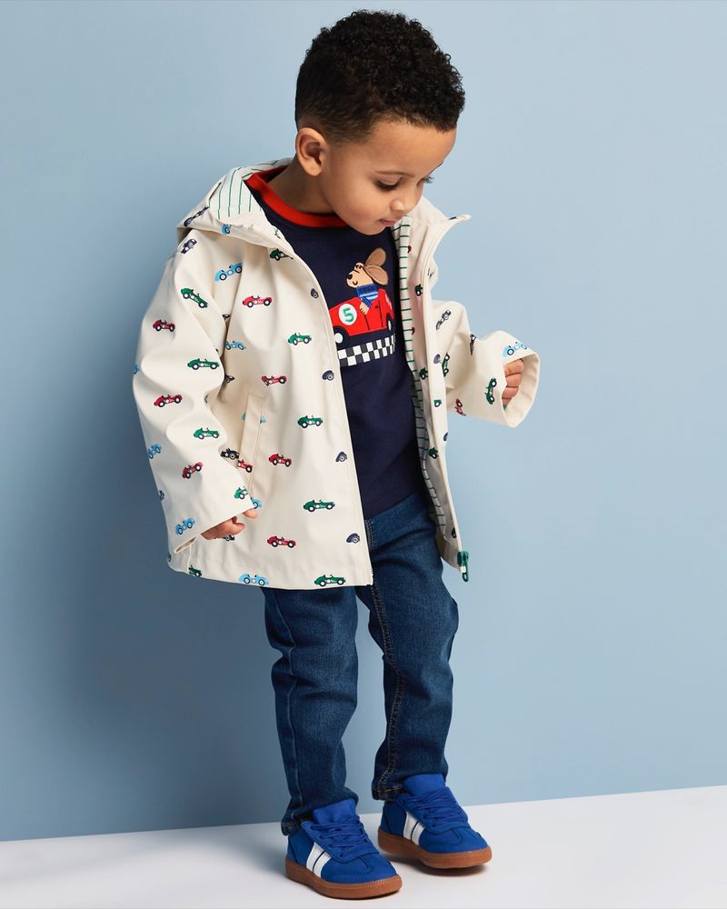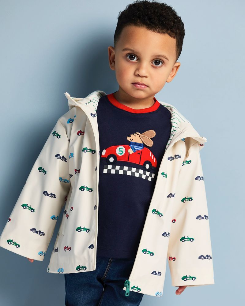 This cream PU rain jacket is printed with playful coloured cars and finished with a soft pure cotton lining. Complete with a hood, it’s a handy layer for drizzly days.