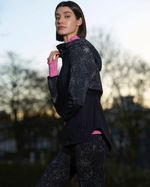 This running jacket features a streamlined, fitted silhouette with a funnel neck and long sleeves for added warmth and coverage. The zip-up front offers versatile styling and easy layering, while the reflective spotted print enhances visibility during low-light or nighttime runs. Matching items available; sold separately.