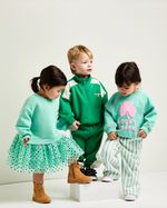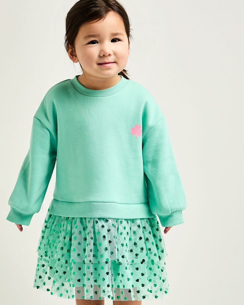 This dress features a cotton-rich sweatshirt printed with a shimmering shamrock and a tulle tutu skirt adorned with a matching all-over pattern. Soft and cosy yet delightfully stylish, it’s perfect for keeping little ones comfortable during St. Patrick’s Day celebrations.