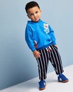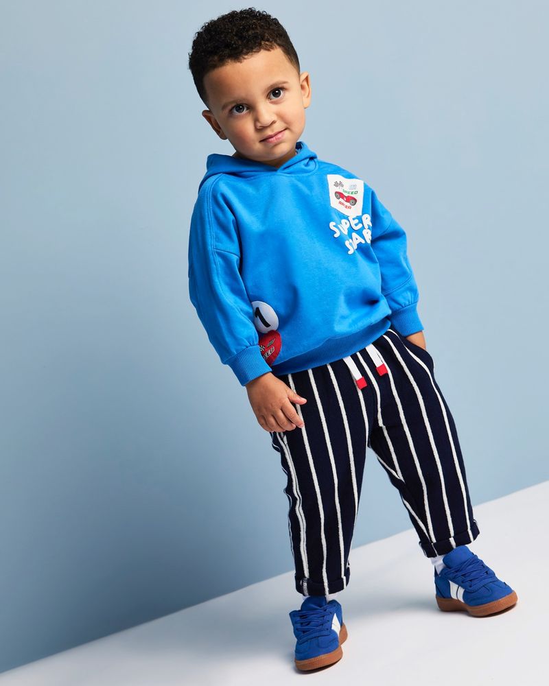This two-piece set features a cosy fleece-lined hoodie, adorned with fun racer-inspired motifs, paired with straight-leg trousers made from textured terry cotton with all-over stripes. An easy, coordinated outfit for their day-to-day activities.