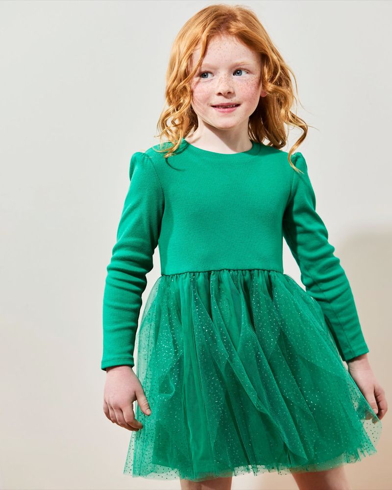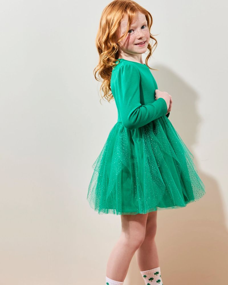 This festive dress features a ribbed, long-sleeved bodice made from a soft, cotton-rich fabric, paired with a mesh tulle skirt adorned with all-over sparkling speckles. A lovely choice for St Patrick’s Day celebrations.
