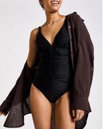 This swimsuit features a deep v-neck framed by plaited straps, with soft ruching through the body and a braided detail down the centre. Enhanced with power mesh lining to smooth and contour, it creates a flattering shape with a confident feel.
