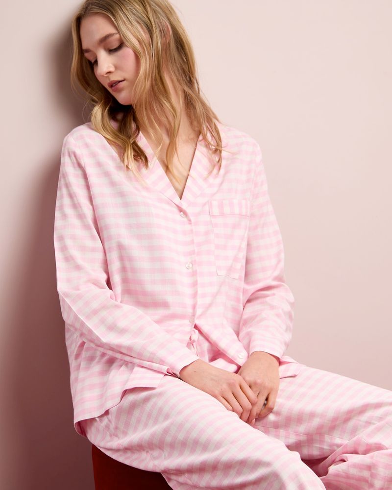 This pyjama set includes a long-sleeved top with a neat revere collar and a classic button-through front, paired with full-length bottoms finished with a comfortable drawstring waist. Woven from a lightweight, cotton-blend fabric, it’s completed with an all-over check pattern.